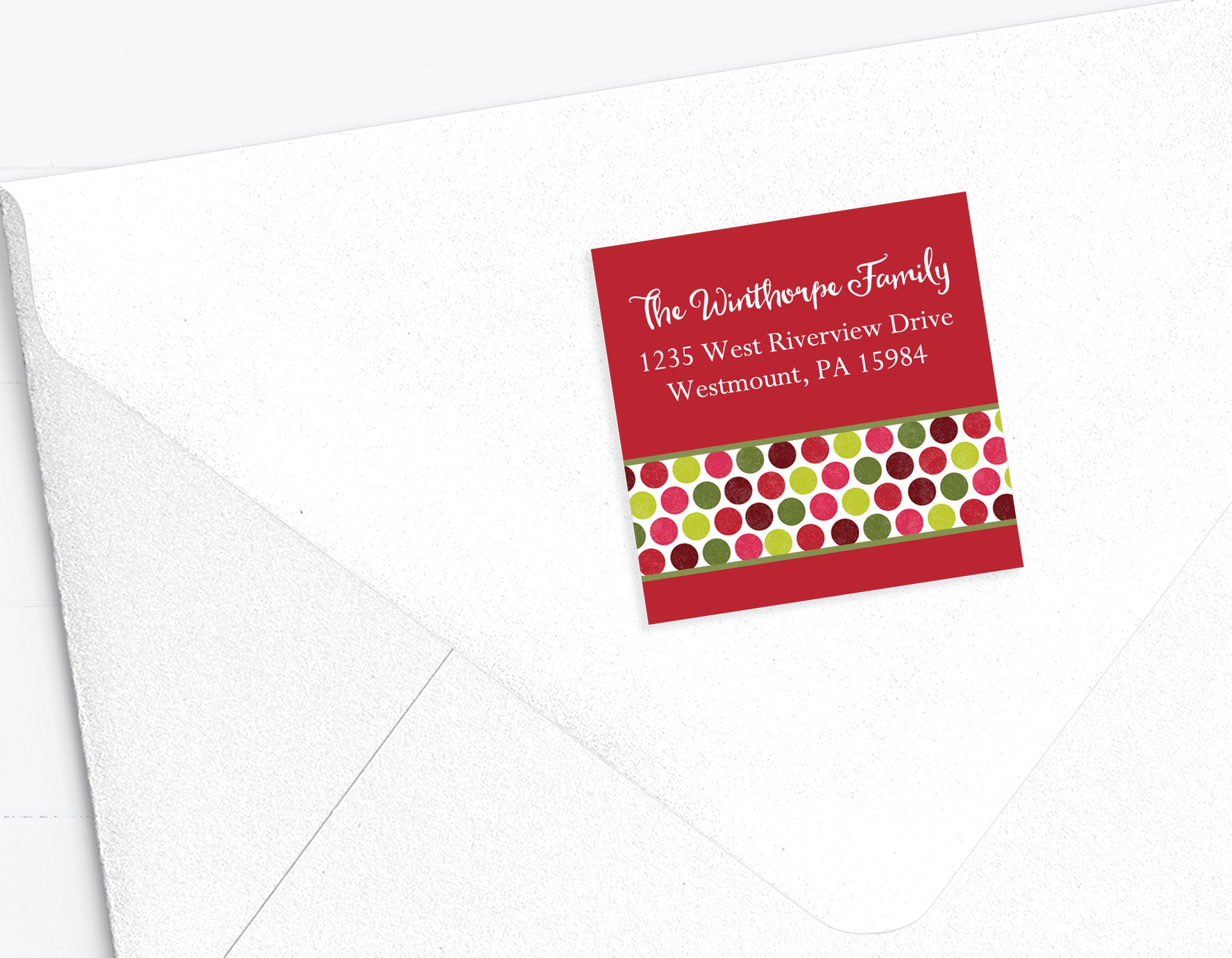 square merry christmas return address labels | sarah + abraham from $15.00 These festive 2" square address labels will add the perfect finishing touch to your Christmas cards and holiday correspondence. They can be used in the top left corner of large envelopes or on the back of smaller envelopes. Please type the text EXACTLY as you'd like it to appear on the labels, including capitalization.