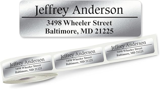 Silver Foil Rolled Address Labels | Current Catalog Details. Our most economical personalized silver foil address labels save you time and money. Roll of 2-1/2" x 3/4" self-adhesive metallic labels comes with a FREE dispenser. We'll print them with the name and address, initial and or symbol you choose. Specify small or large roll. Specify 4 lines, up to 28 characters.