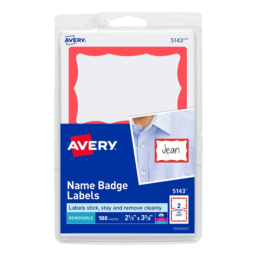 Amazon.com : Avery Hello My Name Is Name Tags, White with ... Personalize name badge labels by hand or print your custom stickers on the 4" x 6" sheets with your laser or inkjet printer ; Easily create custom name tags using the free designs and templates on the Avery website ; Name badge labels stick firmly to most fabrics without curling or falling off, yet remove cleanly and easily Amazon.com: Avery Personalized Name Tags, Print or Write ... Jun 01, 2007 · Product Description. Create polished, professional-quality customized name tags with minimal time and effort using Avery adhesive name tags. These name tag labels have an elegant gold border and use a removable adhesive that sticks securely to clothing but removes cleanly and easily when your event has ended.